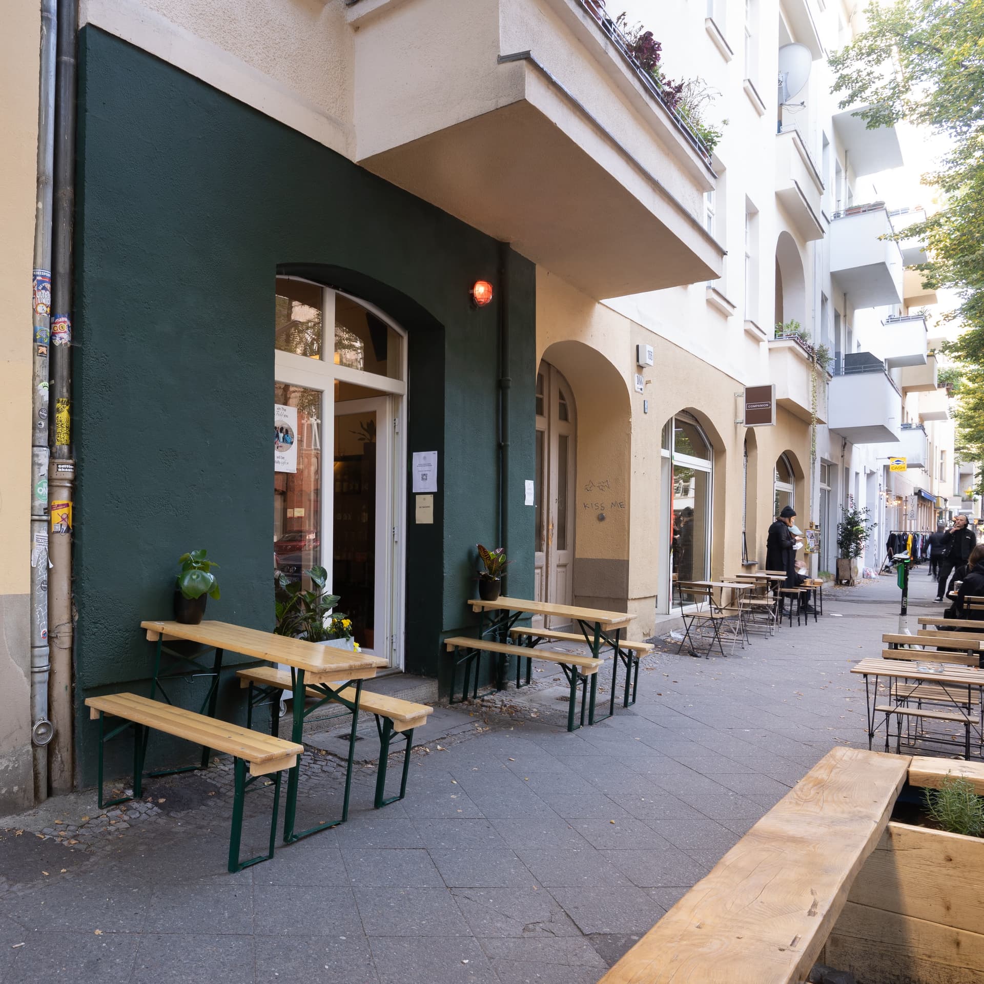 • The space is situated at Weserstr. 166, 12045 Berlin, identifiable by its green exterior and bar-like appearance.
