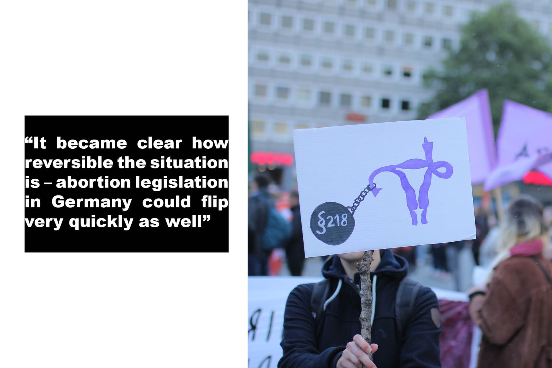 “Scrapping 219a has been more symbolic than tangible,” says Lana Saksone, a doctor and representative of Doctors for Choice Germany (DfC). “They’ve left 218 in the criminal code, there are still no protection zones for practices providing abortion care, and the anti-choicers are getting bolder.” She points to an abortion clinic that opened in Dortmund last December, where death threats were sent to doctors, nurses and technical staff. “Abortion is still illegal and stigmatised in Germany.”